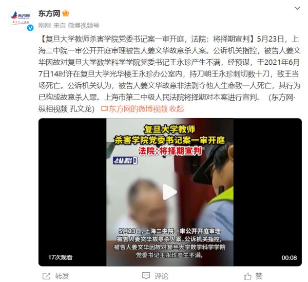 5月23日,上海二中院一审公开开庭审理被告人姜文华故意杀人案。公诉机关指控,被告人姜文华因故对复旦大学数学科学学院党委书记王永珍产生不满,经预谋,于2021年6月7日14时许在复旦大学光华楼王永珍办公室内,持刀朝王永珍刺切数十刀,致王当场死亡。公诉机关认为,被告人姜文华故意非法剥夺他人生命致一人死亡,其行为已构成故意杀人罪。上海市第二中级人民法院将择期对本案进行宣判。