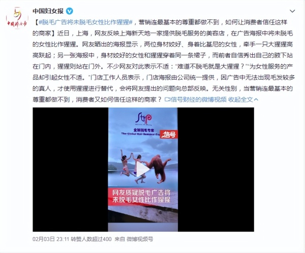 导读:近日,网友反映上海一家提供脱毛服务的美容店,在广告海报中将未脱毛的女性比作猩猩。对此,美容店表示,因广告中无法出现毛发较多的真人,才用猩猩替代。