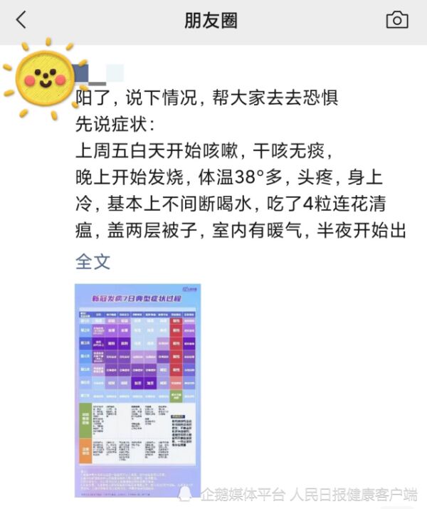 症状减轻后,身体有了力气,小李第一时间发了朋友圈,分享自己这几天的经历,“我觉得大家了解这个情况是有必要的,感染了可能会高烧,可能身上会酸软疼痛,但是只要有药,就不要过于担心,一一对照症状,挺过前几天,慢慢状态会向好。”