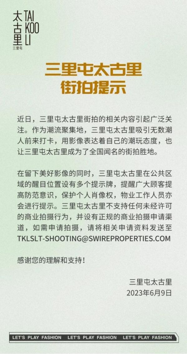 三里屯太古里针对街拍发表的官方声明。图/三里屯太古里微信公号