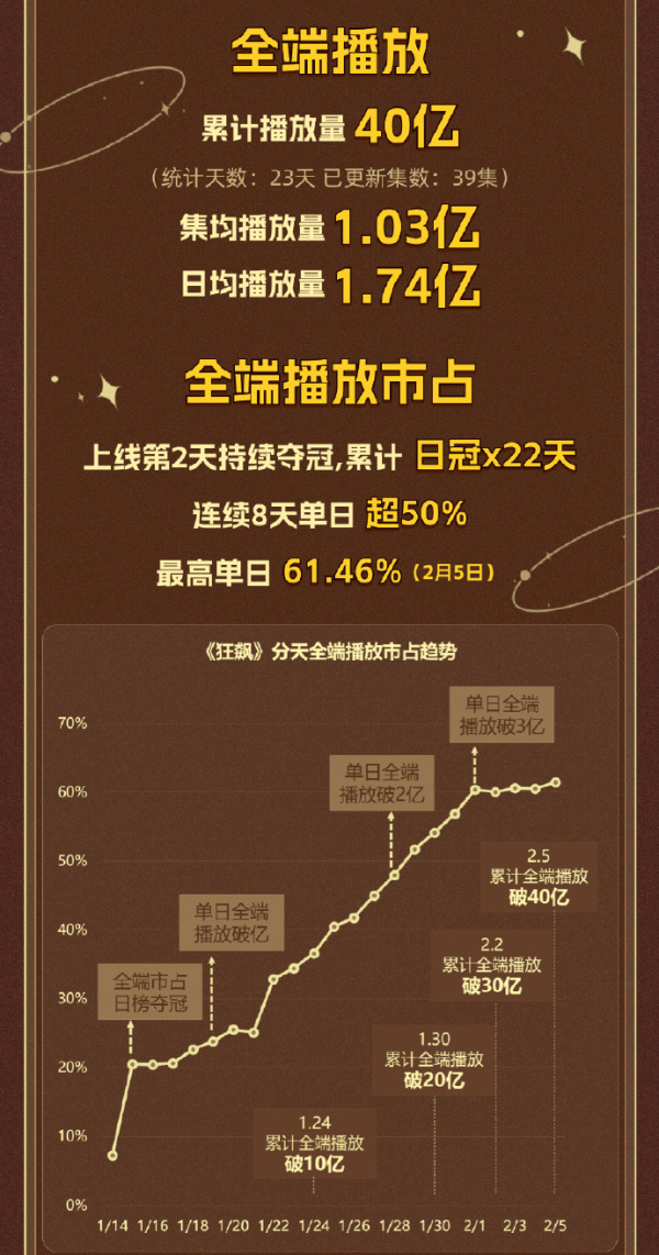 全端播放量突破40亿,位居一月榜首。单日全端播放量最高突破3亿,集均播放量1.03亿,日均播放量1.74亿。