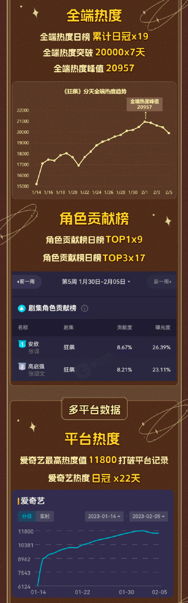 热度打破天花板,全端热度突破20000,平台站内热度最高11800,打破平台纪录,站内热度日冠22天;全端热度日冠19天,全端热度突破20000,有7天,全端热度峰值20957。