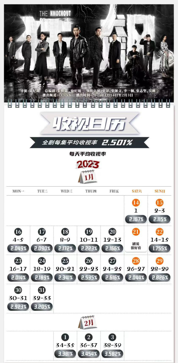 而在总局公布的央八《狂飙》收视数据中,全剧每集平均收视率2.501%,最高收视3.582%,出现在大结局39、39集;最低收视1.755%,也是唯一一天收视跌破2,出现在14、15集,大年初二,当然这是受到春节影响,不过仅仅只有一天时间。