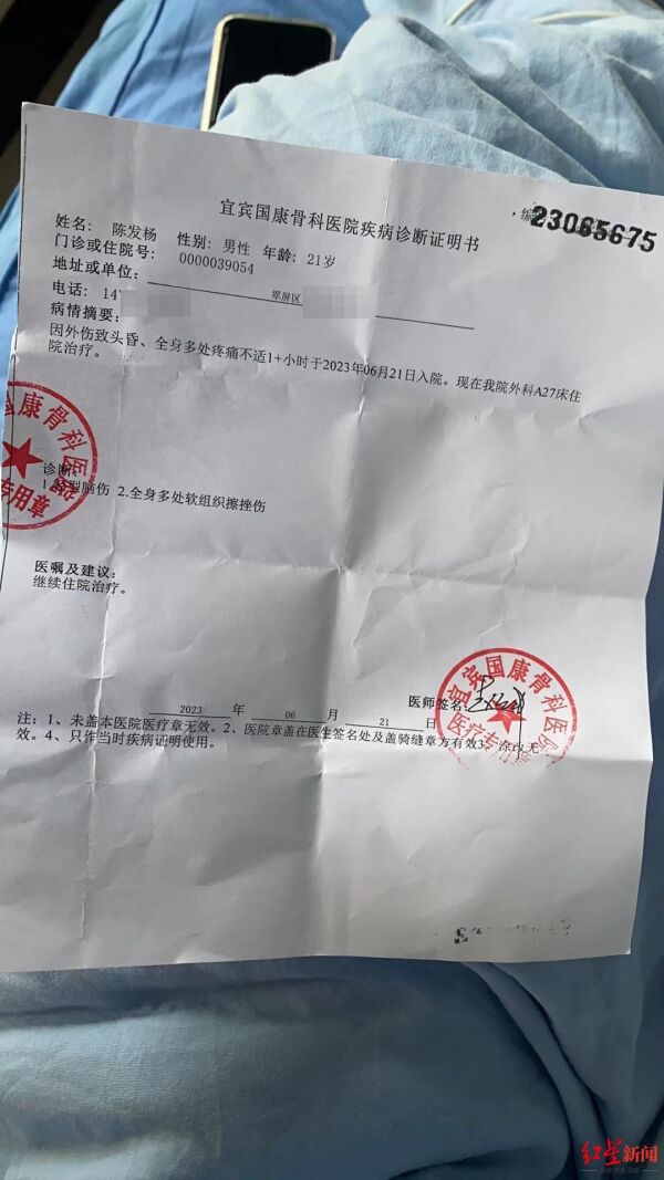 6月24日,陈发杨还没出院,下床都需要人搀扶。21日,他骑摩托车经过四川宜宾市新街(宜宾学院B区东门附近)去上班时,被一根打结成圈的电缆线套住脖子拽翻在地窒息,幸亏后车制动及时,否则后果不堪设想。后车行车记录仪和附近监控记录下惊心动魄的瞬间。