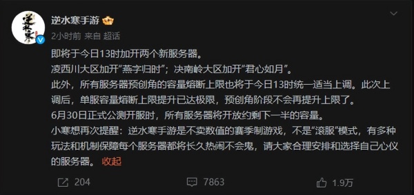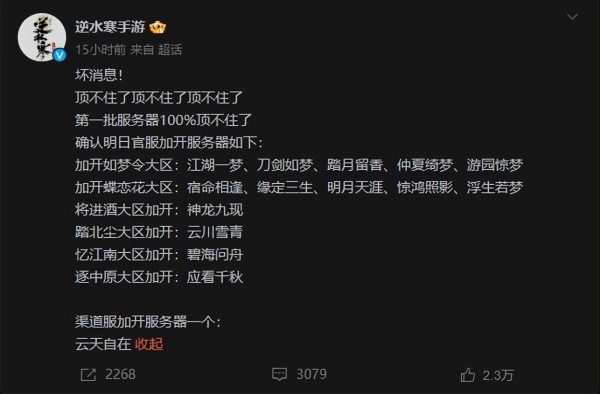 而因为客户端下载数量远超官方想象,因此,在26日晚间,《逆水寒》手游官方就宣布游戏第一批服务器已经全部“爆满”,将临时加开江湖一梦、宿命相逢等14个新服务器,以应对玩家们的热诚。