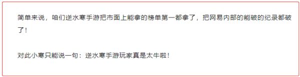 目前,《逆水寒》手游已经横扫了市面上所有手游预约、下载榜单,官方也表示“把市面上能拿的榜单第一都拿了,把网易内部的能破的纪录都破了!”。