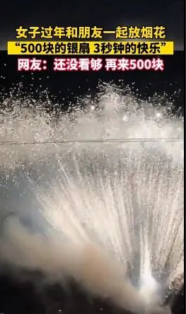 导读:1月21日,江苏南通,女子过年花500块钱买了烟花和朋友一起放,但是壮观场面只持续了3秒钟,女子称:“500块的银扇,3秒钟的快乐”。