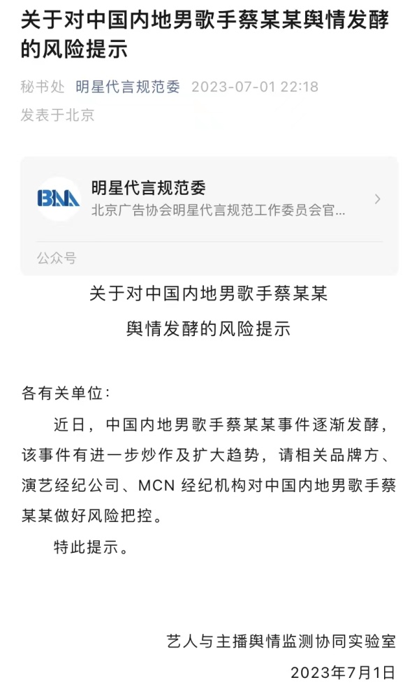 新京报讯 7月1日晚,北京广告协会明星代言规范委发布关于对中国内地男歌手蔡某某舆情发酵的风险提示。以下为全文: