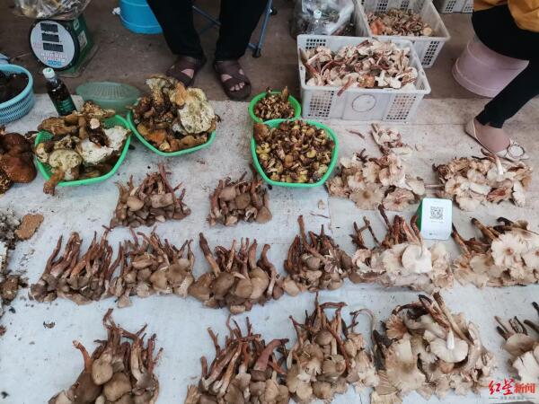 该市场多名商贩告诉红星新闻记者,今年鸡枞刚上市的时候,卖到了上千元一斤,目前大多在两三百元一斤,品质好的鸡枞也能卖到四五百一斤。“今年天干,菌子少了很多,产量少自然价格就高。”