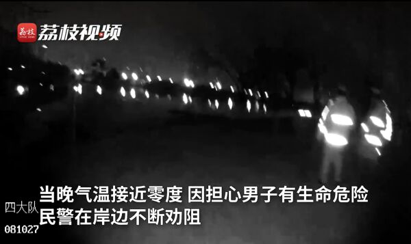 “你游不过去,有警车在那边。”“师傅你赶紧上来,不要对自己的生命不负责任!”“太冷了,你快过来吧!”视频内容显示,多位民警正在岸边呼喊,劝诫男子上岸。