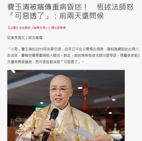 7月11日,关于68岁歌手费玉清病危住院的消息引爆网络,甚至网上那边已经传出了“费玉清死讯”,对此,费玉清的亲姐姐恒述法师亲自露面接受媒体采访,澄清了相关的事情。