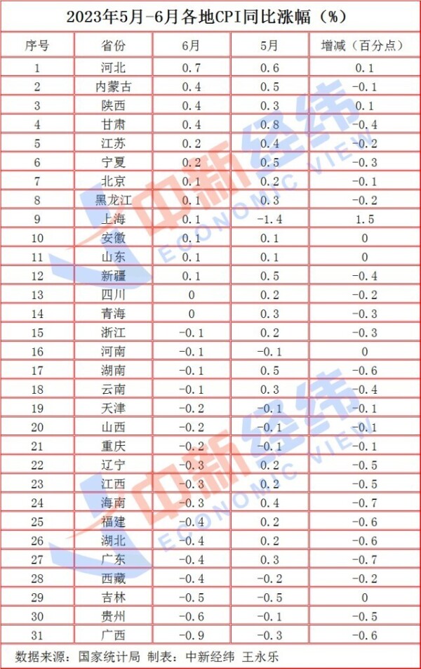 导读:日前,国家统计局公布了31省份2023年6月居民消费价格指数(CPI)。记者梳理发现,6月,17省份CPI同比下降。