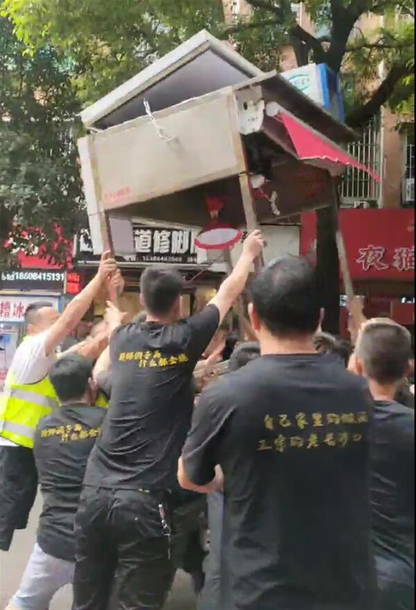 视频显示,一个市场内多人聚集并发生冲突,有人举起摊贩的售货亭扔到路边,现场许多人围观,还有人在敲盆子造声势。