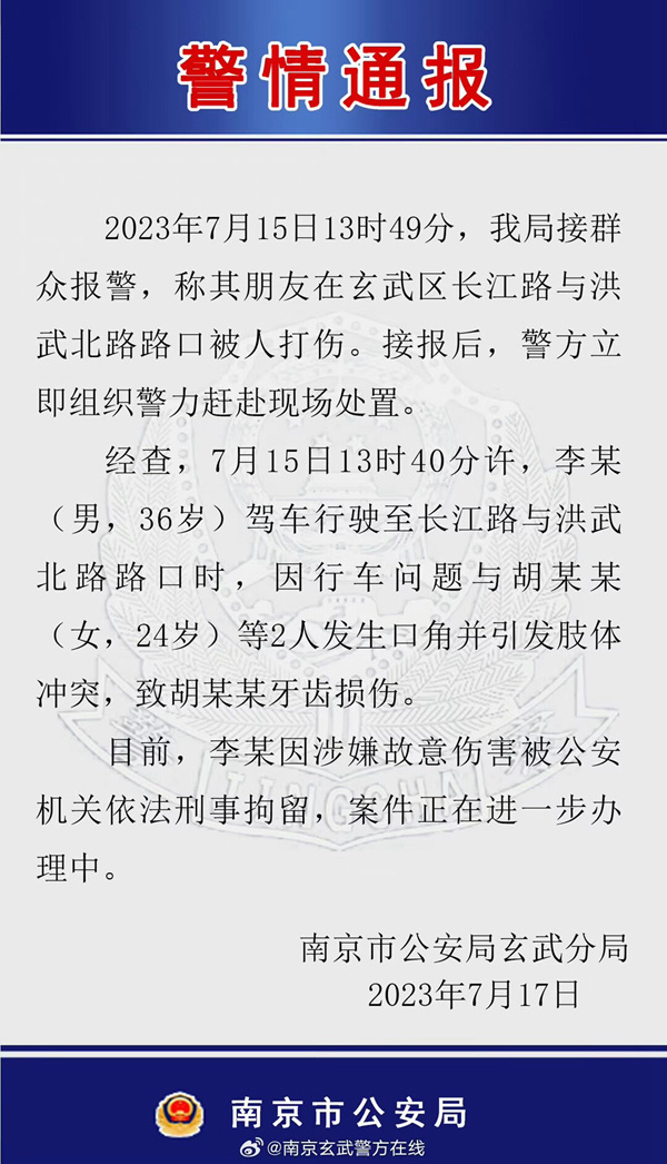 通报显示,7月15日13时49分,玄武分局接群众报警,称其朋友在玄武区长江路与洪武北路路口被人打伤。接报后,警方立即组织警力赶赴现场处置。经查,7月15日13时40分许,李某(男,36岁)驾车行驶至长江路与洪武北路路口时,因行车问题与胡某某(女,24岁)等2人发生口角并引发肢体冲突,致胡某某牙齿损伤。目前,李某因涉嫌故意伤害被公安机关依法刑事拘留,案件正在进一步办理中。