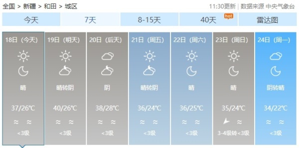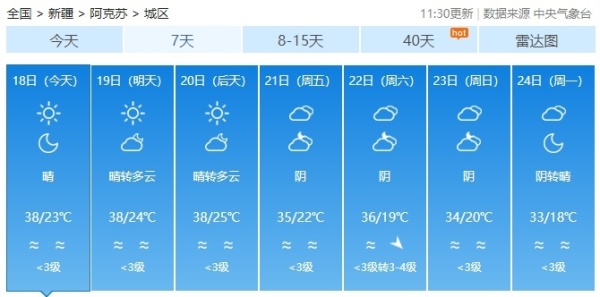 7月17日,新疆多地持续“火热”。当日15时,中央气象台的全国最高气温实况排行榜再次被新疆包揽,上榜10地均在40℃以上。