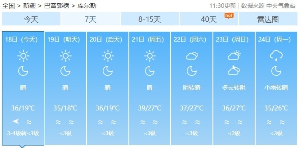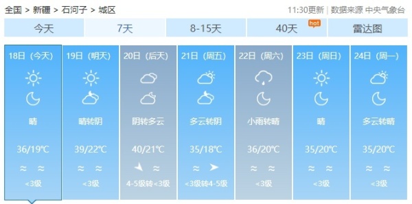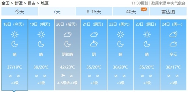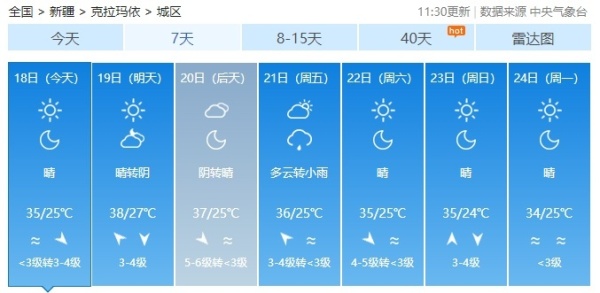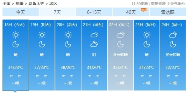今日至21日白天,南疆、东疆和伊犁哈萨克自治州西部、塔城地区北部、阿勒泰地区、天山北坡等地的部分区域最高气温可在37℃以上,博尔塔拉蒙古自治州、塔城地区、克拉玛依市、石河子市、昌吉回族自治州、乌鲁木齐市北部、喀什地区、和田地区、阿克苏地区等地的部分区域最高气温可在40℃以上。新疆气象台7月14日12时12分发布的高温红色预警信号继续有效。