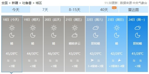 新疆气象台发布的最新预报显示,预计到21日白天(南疆、东疆至23日)全疆平原大部维持35℃以上的高温天气,其中吐鲁番市、哈密市局地最高气温可在45℃以上。