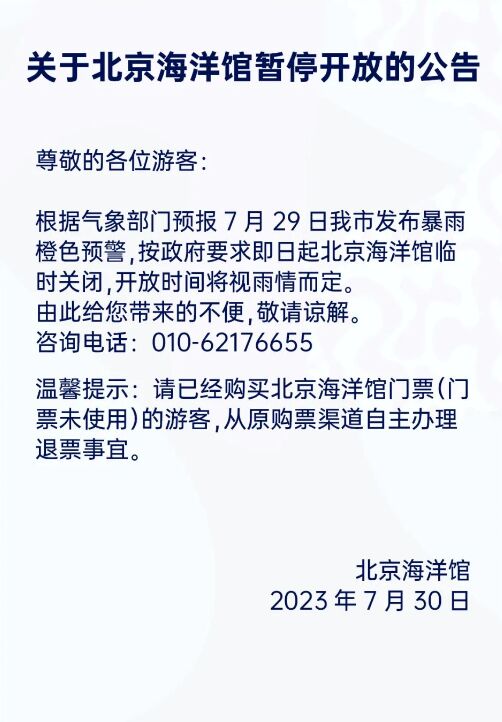北京海洋馆临时闭馆昨晚,北京海洋馆发布消息:按政府要求,即日起北京海洋馆临时关闭,开放时间将视雨情而定。