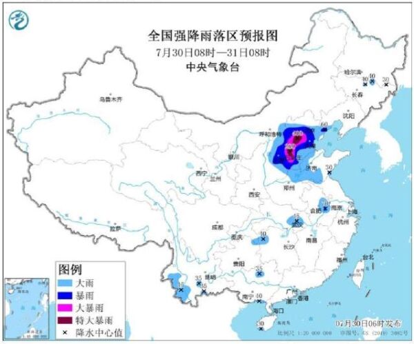 预计,7月30日08时至31日08时,河北、北京、天津山西中东部河南北部、山东中西部等地有大到暴雨,其中,河北中南部、北京中南部、天津西部、山西东部等地部分地区有大暴雨,河北中部沿山地区、北京西南部等地部分地区特大暴雨(250~400毫米):安徽中部、湖北东部和南部湖南北部、贵州北部云南西南部吉林北部等地部分地区有大雨或暴雨。上述部分地区伴有短时强降水(最大小时降雨量30~70毫米局地可超过100毫米)局地有雷暴大风等强对流天气。