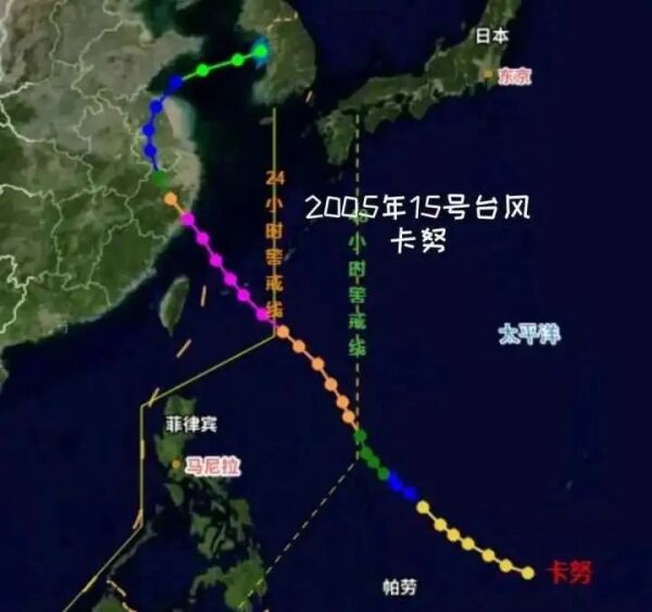 巧合的是,2005年第15号台风“卡努”曾在台州市路桥区金清镇登陆,浙江普降大到暴雨,造成台州、宁波、舟山等10个地市、56个县(市、区)严重受灾。十八年后,重生的“卡努”路径大概率又是朝浙江奔来。