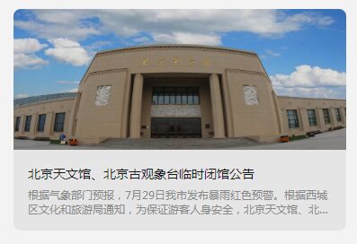 北京天文馆临时闭馆昨日,北京天文馆发布通知:根据气象部门预报,7月29日北京市发布暴雨红色预警。根据西城区文化和旅游局通知,为保证游客人身安全,北京天文馆、北京古观象台将于7月30日起临时闭馆,恢复开馆时间另行通知。