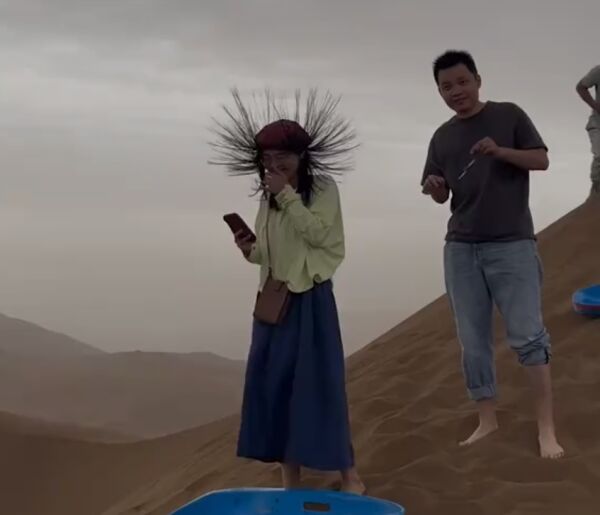 近日,新疆吐鲁番市发生了一幕异常的景象,一名游客的头发竟然像刺猬般竖立起来,整个头发纷纷悬浮在空中。这一奇特现象在网络上引发了热议,不少网友纷纷解读这可能是雷击的前兆,警示着临近雷雨天气。