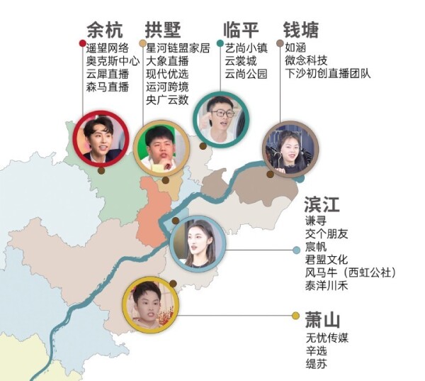 除了雪梨、张大奕、瑜大公子、烈儿宝贝等传统直播电商头部主播,这里还聚集着无忧传媒、谦寻、如涵、缇苏、宸帆、遥望、微念科技等头部直播机构和MCN机构,以及从北京、广州等地大量涌入的网红和明星达人主播,形成了一张杭州直播地图。