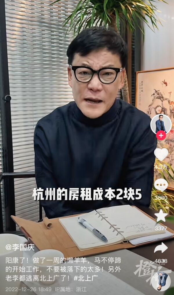 视频里,杭州的新办公室还处于装修收尾阶段。“老李”说,自己已经逃离北上广,在杭州开了新的直播间。对于来杭州的原因,“在杭州租的公司场地房租一天2.5元,在北京则是7.8元。”