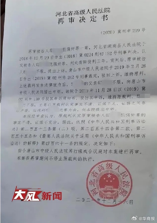 河北省高院审查认为,原裁判认定原审被告人邸某犯强奸罪的事实不清,证据不充分。2021年12月16日,河北省高院决定:指令唐山市中院另行组成合议庭对此案进行再审。
