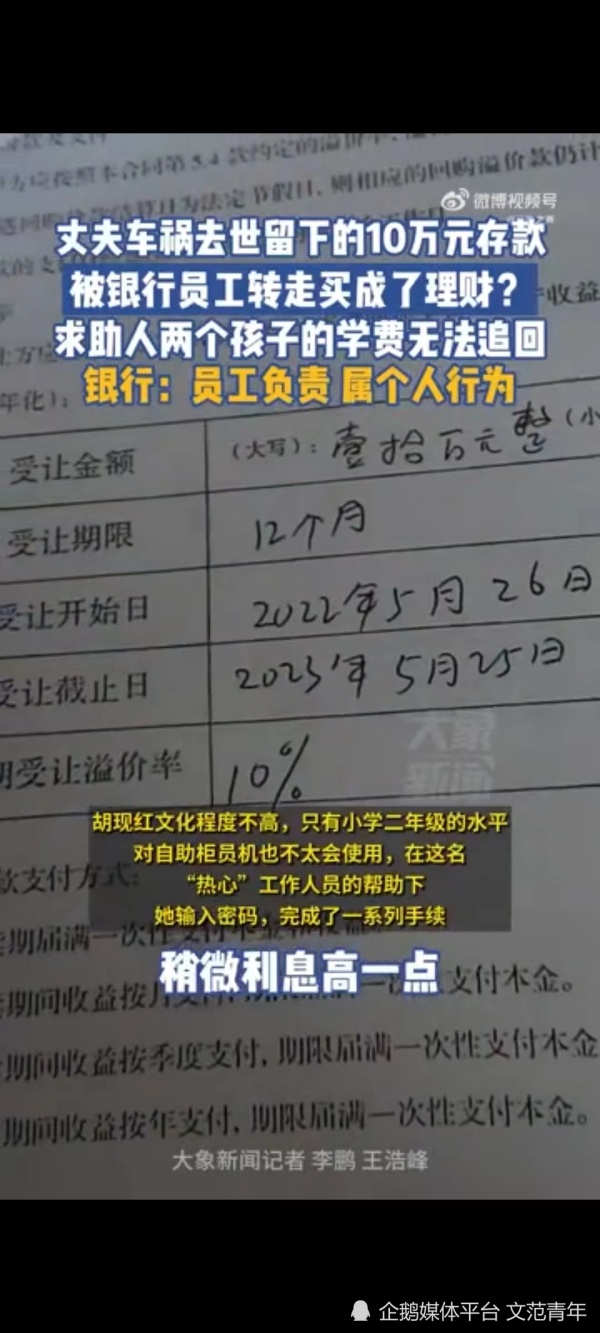 据胡女士透露,她丈夫去世后,留给她的10万元存款一直存放在周口某银行。直到她去银行取款时,才发现自己的存款已经被用于购买了理财产品。胡女士表示,当初银行员工帮助她存款时,并没有告知她将会用于购买理财产品,也没有签署任何相关文件。然而,在胡女士多次与银行交涉无果后,银行方面却声称这是员工个人行为,与银行无关。