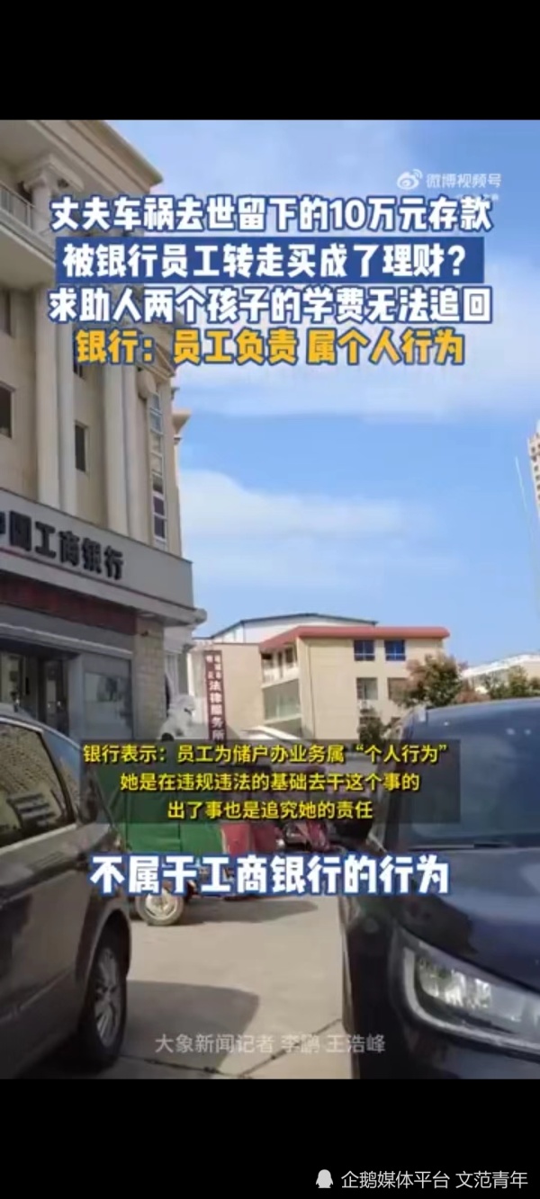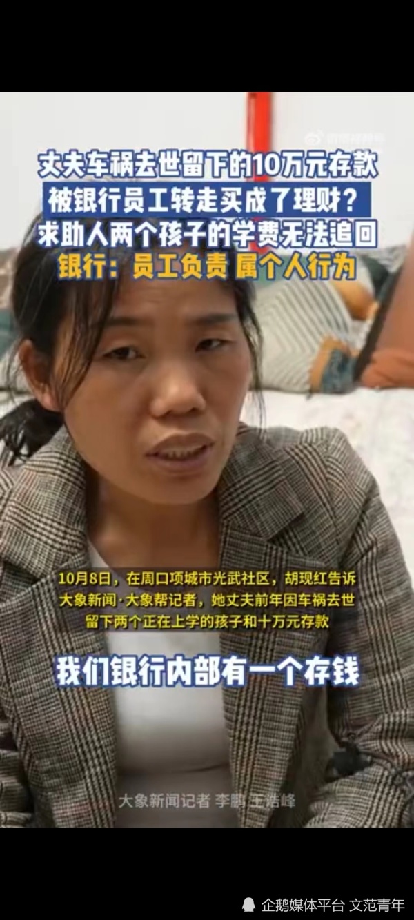 最近,河南周口发生了一起让人愤怒的事件,胡女士向媒体报料,她的10万元存款被银行员工转走,且用于购买了涉嫌非法集资的理财产品。这个家庭原本已经属于风雨飘摇的状态了,却因银行的不负责任而遭受更大的打击。然而,银行却回应称这是员工个人行为,真是让人难以接受。