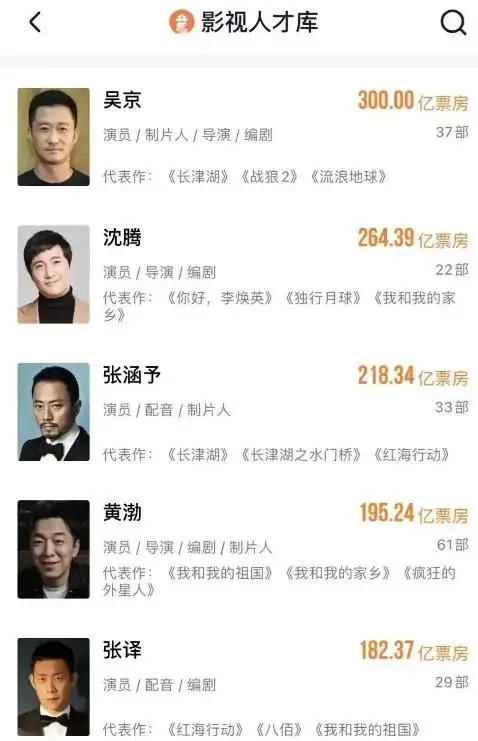 看排名第二的沈腾,他友情出演的《你好李焕英》把票房算进去了,还有排名靠前的张涵予,黄渤等,也有我和我的祖国,以及长津湖这类三番角色开外的电影,按照现在的话说,这只能叫“蹭票房,不能算实绩”。