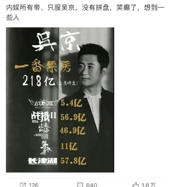 本来是一件值得庆贺的事儿,各大媒体和博主都在发文祝福。可其中,还引起了一点争议。起因是有一个博主发了“内娱所有帝,只服吴京,没有拼盘”。