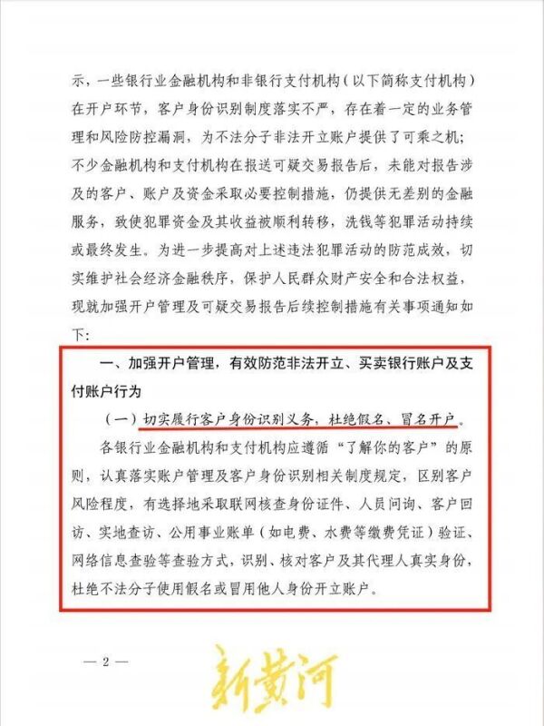 新黄河记者了解到,依据中国人民银行发布的《中国人民银行关于加强开户管理及可疑交易报告后续控制措施的通知(银发〔2017〕117号)》第一条规定,加强开户管理,有效防范非法开立、买卖银行账户及支付账户行为。其中第一款明确提出,切实履行客户身份识别义务,杜绝假名、冒名开户。各银行业金融机构和支付机构应遵循“了解你的客户”的原则,认真落实账户管理及客户身份识别相关制度规定,区别客户风险程度,有选择地采取联网核查身份证件、人员问询、客户回访、实地查访、公用事业账单(如电费、水费等缴费凭证)验证、网络信息查验等查验方式,识别、核对客户及其代理人真实身份,杜绝不法分子使用假名或冒用他人身份开立账户。