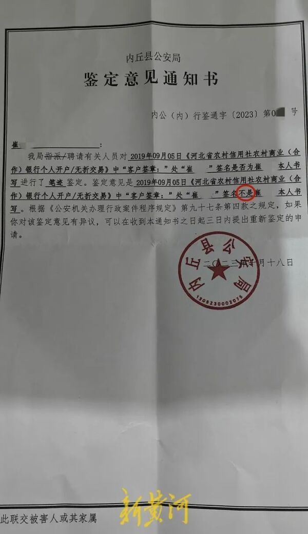 本人不在却成功办卡?信用社称流程合规崔女士告诉记者,警方接案后,内丘县公安局对办理开卡业务单据上的签字进行了笔迹鉴定,鉴定结果显示,该签名并非崔女士所签署。而内丘县公安局出具的《鉴定意见通知书》,也证实了崔女士的这一说法。在这份《鉴定意见通知书》中载明:《河北省农村信用社农村商业(合作)银行个人开户/无折交易》“崔某某”签名不是她本人书写。