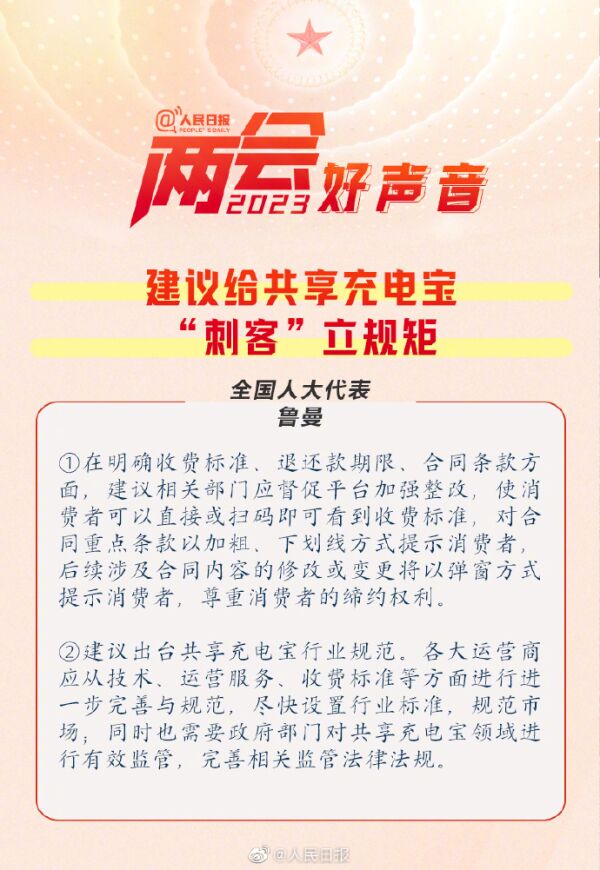 收费不规范、收费价格飞涨、押金未及时退还……使用共享充电宝,你遇到过这些问题吗?对此,全国人大代表鲁曼建议:建议出台共享充电宝行业规范;在明确收费标准、退还款期限、合同条款方面,相关部门应督促平台加强整改,使消费者可以直接或扫码即可看到收费标准。