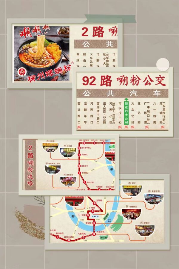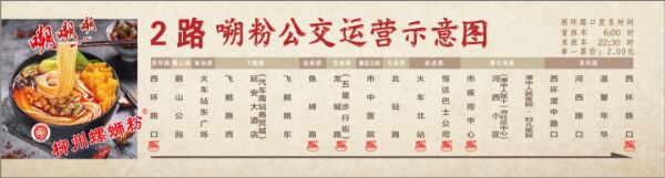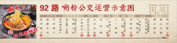 目前,柳州恒达巴士公司已经完成设计并制作“螺蛳粉公交专线”、“嗍粉公交线路”车辆螺蛳粉广告元素,重新设计制作2路、92路的线路牌样式,突出螺蛳粉元素,标明沿线网红螺蛳粉店的名称。同时在柳州火车站和龙城路公交站台,设置线路走向图,便于乘客了解沿线螺蛳粉店的分布点,方便“嗍粉”客人选择下车站点。根据全市网红螺蛳粉店的地理分布,编制“嗍粉”公交攻略,同步与2路和92路一并进行对外宣传。同时,结合支付宝新人免费乘车活动,联动“支付宝”平台“嗍粉公交”沿线合作商家投放满减优惠券,吸引商家顾客搭乘公交出行。