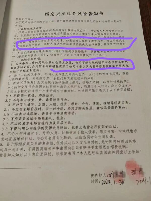 毛均和刘依签订的“婚恋交友服务风险告知书”(受访者供图)