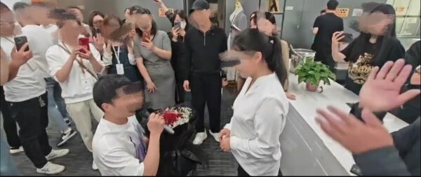 男人捧着一束鲜花,半跪在女人面前,围观的四五十人吆喝不断,争相拍照拍视频。在主持人慷慨激昂的祝福声中,女子接过鲜花,说了一声“愿意”,礼花开始炸响,两人轻轻拥抱。