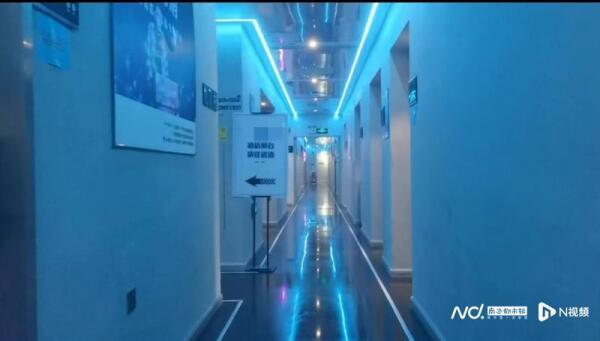 某电竞酒店走廊,蓝色的灯带看起来充满科技感。