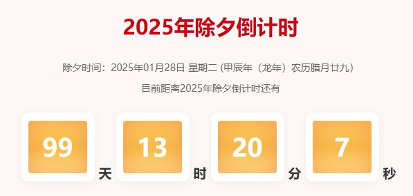 今天(10月20日),距离2025年蛇年除夕还有99天,过年倒计时进入2位数。今年除夕在2025年1月28日,农历为腊月二十九,依旧是没有农历大年三十的除夕。一年的时间转瞬即逝,网友们纷纷感慨时间过得太快了。