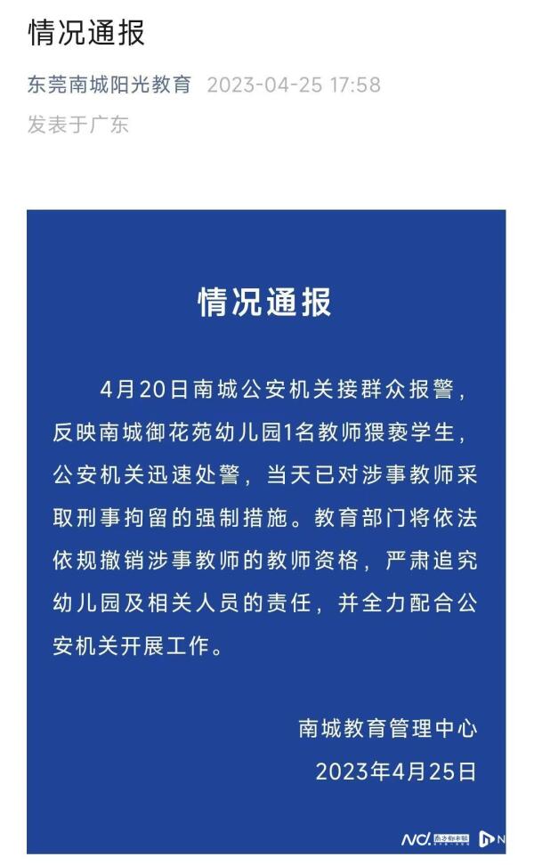 2023年4月25日,东莞南城教育管理中心发布情况通报。通报称,4月20日南城公安机关接群众报警,反映南城御花苑幼儿园1名教师猥亵学生,公安机关迅速处警,当天已对涉事教师采取刑事拘留的强制措施。教育部门将依法依规撤销涉事教师的教师资格,严肃追究幼儿园及相关人员的责任,并全力配合公安机关开展工作。