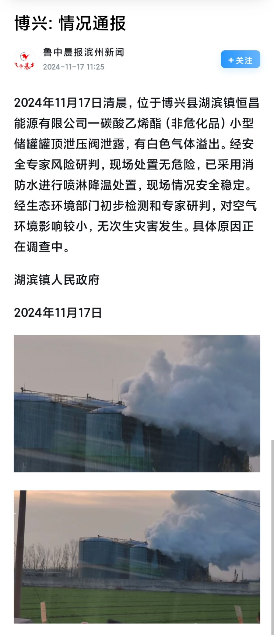 经多部门核实,截至11月17日13时,泸州辖区内未发生天然气储存罐泄露事件,该视频疑为山东省某地于2024年11月17日清晨发生的一起碳酸乙烯酯泄露事件。请各位网友不信谣,不传谣。