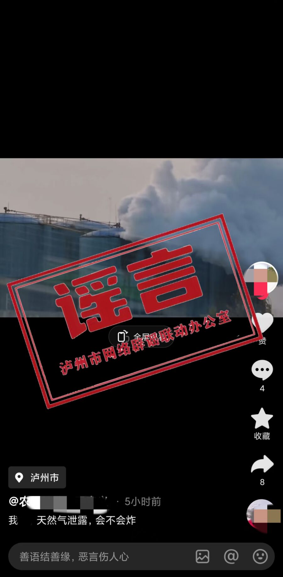 11月17日,有网友通过短视频平台发布视频,配文称“天然气泄露,会不会炸”,并定位“泸州市”。