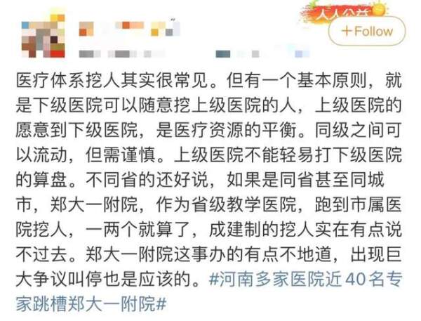 据媒体报道,5月17日,郑州市第七人民医院和阜外华中医院心血管病医院的近40名医生,集体跳槽到郑州大学第一附属医院。这些跳槽的医生中,有的上午还在做手术,下午就去新单位上班了。平均年龄42.3岁,省内一流的心血管学科人才同时跳槽,一时间将公众的情绪拉到了顶端。