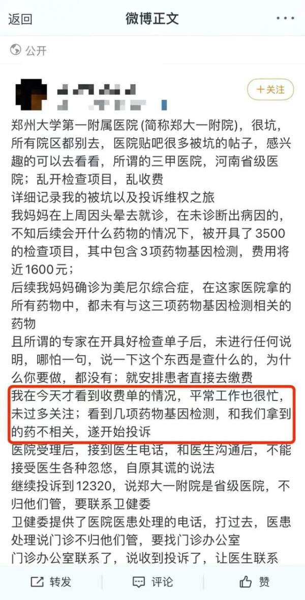不仅如此,此前张玮认识的一位朋友去郑大一附院看病,他无意中发现,病人化验清单中有几项没有做的也计费了。很多朋友都跟他抱怨过,郑大一附院收费存在很多分解收费、套餐收费的情况。