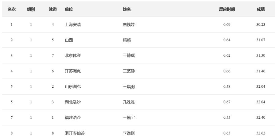 唐钱婷出战第4泳道,出发反应时间0秒69,以30秒23的成绩排名第一获得金牌。