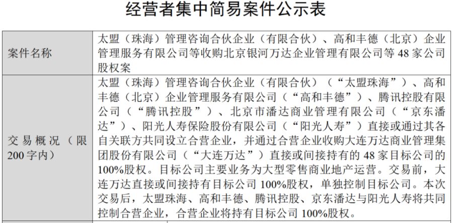 据国家市场监管总局近日披露的信息,太盟(珠海)管理咨询合伙企业(有限合伙)(以下简称“太盟珠海”)、高和丰德(北京)企业管理服务有限公司(以下简称“高和丰德”)、腾讯控股有限公司(以下简称“腾讯控股”)、北京市潘达商业管理有限公司(以下简称“京东潘达”)、阳光人寿保险股份有限公司(以下简称“阳光人寿”)直接或通过其各自关联方共同设立合营企业,并通过合营企业收购大连万达商业管理集团股份有限公司(以下简称“大连万达”)直接或间接持有的48家目标公司的100%股权。