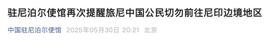 5月30日,“中国驻尼泊尔使馆”微信公众号发布消息:再次提醒旅尼中国公民切勿前往尼印边境地区——