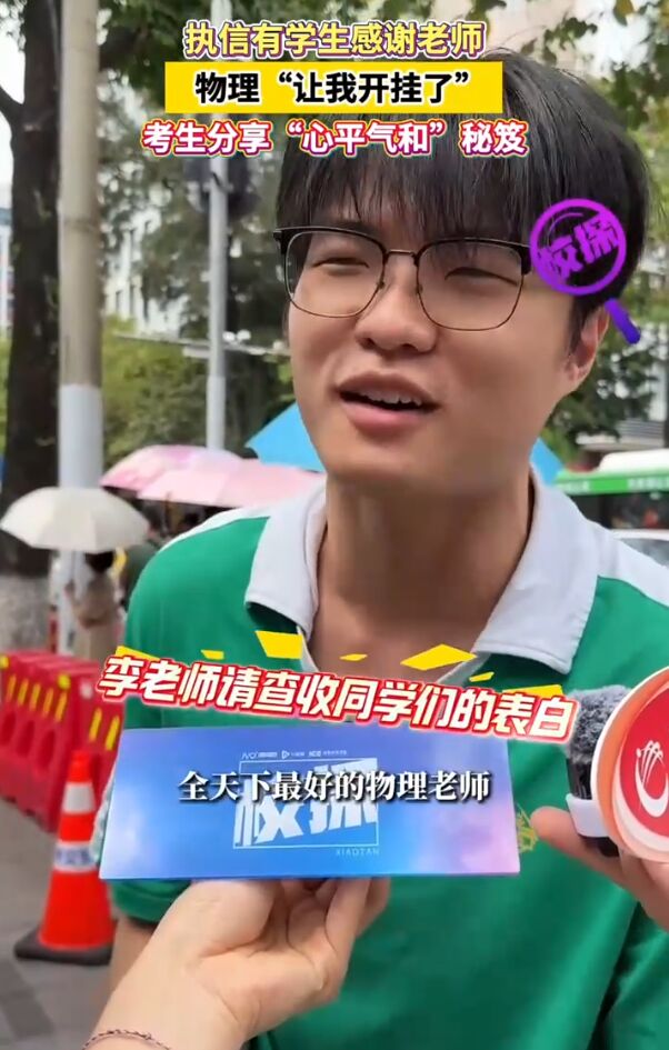 能看得出来,走出考场后,这名男生相当兴奋,其他学生对着记者和镜头都是避之不及,而这名男生则是主动找镜头,而且还没等记者开问,就直接开口介绍老师,甚至将这位李老师称之为全天下最好的物理老师,只要跟着老师的方向走就是对的,每道题都感觉像是做过原题